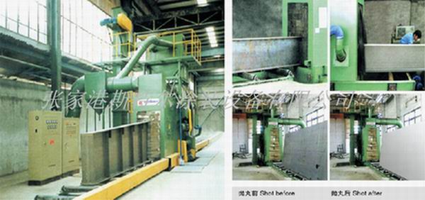 This machine is mainly composed of clean room, indoor rollor conveyeer and in and out of rollor conveyeer, shot device, projectile circulation system (including hoist, separator, vertical and horizontal conveyor for spiral pipe) , purging institutions, dust removal, electrical control function components.
